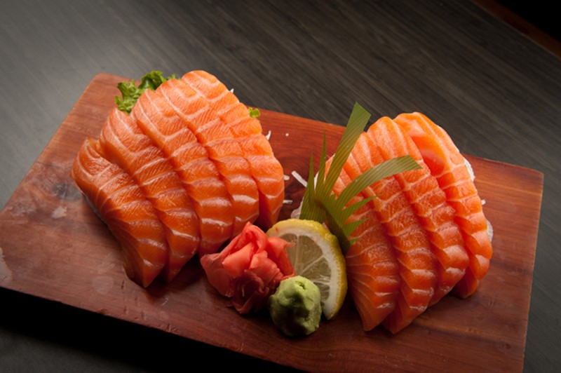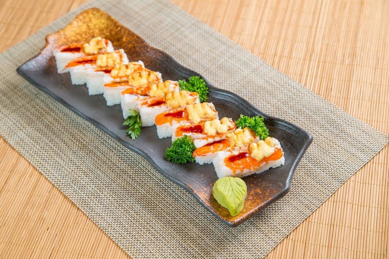 4pcs salmon sushi, 6pcs spicy salmon maki, and 4pcs salmon sashimi